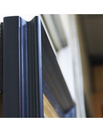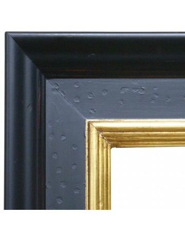cadre en bois à coins bouchés noir décors de plume et fleurs, peint à la main, doré à la feuille de cuivre, profil:110x50 mm